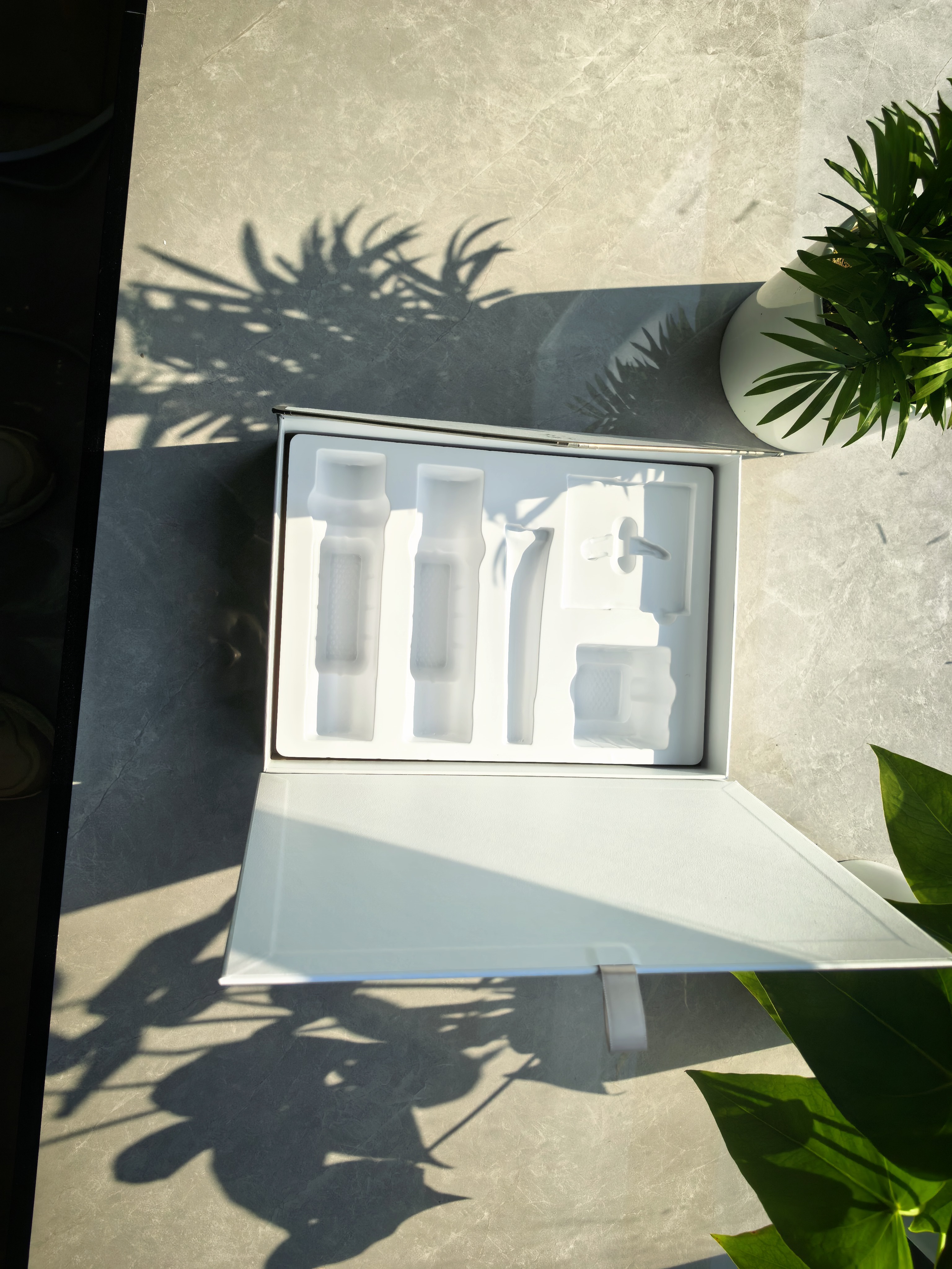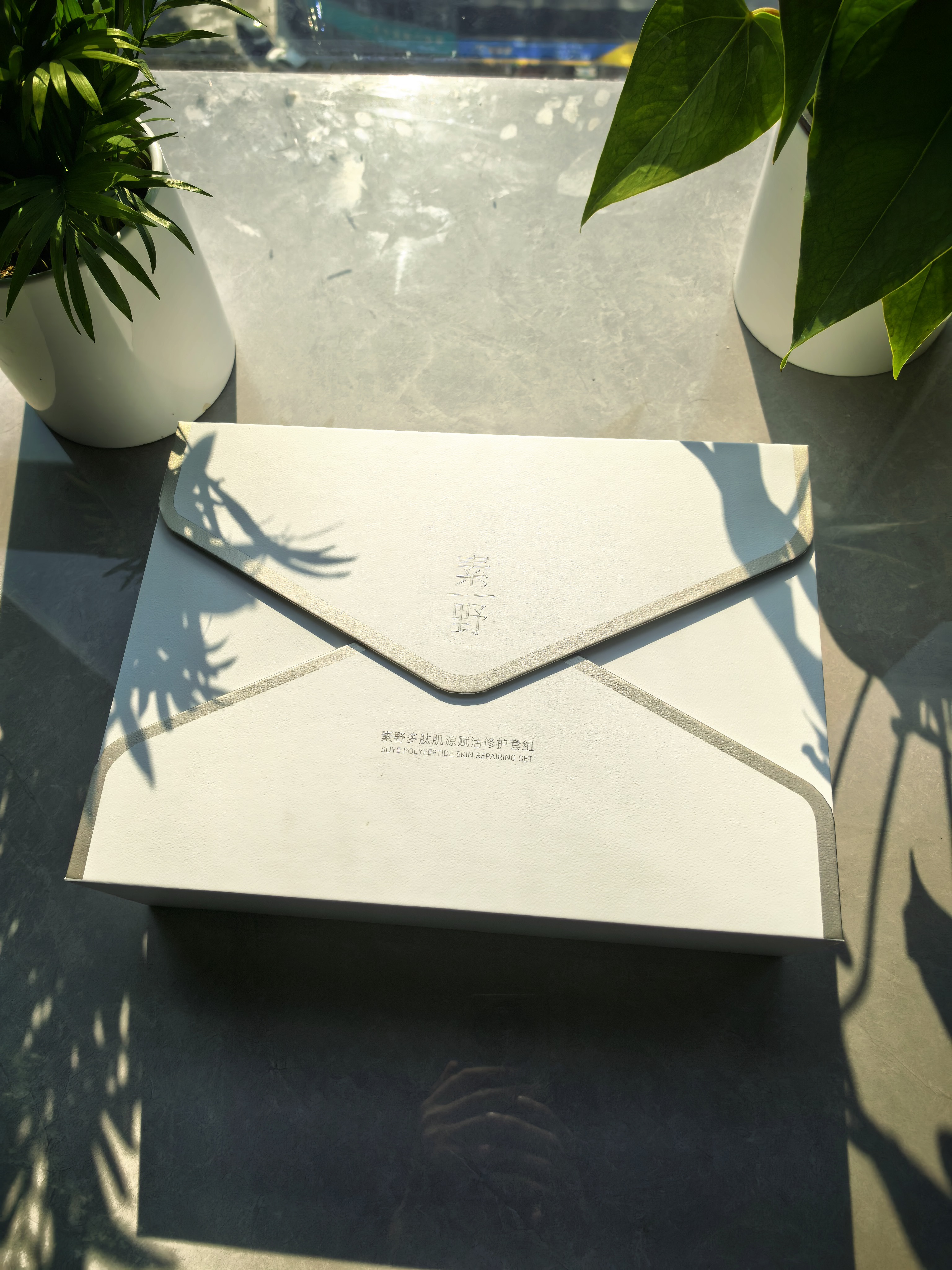 Envelope flip gift box, magnetic closure. The combination of beige textured paper with embossed logo and silver gray lines creates a simple and luxurious look. Built in multi zone tray for neatly securing skincare products or small accessories. Customized design combines storage and protection, showcasing high-end delicacy, making it an excellent choice for gift giving and display.